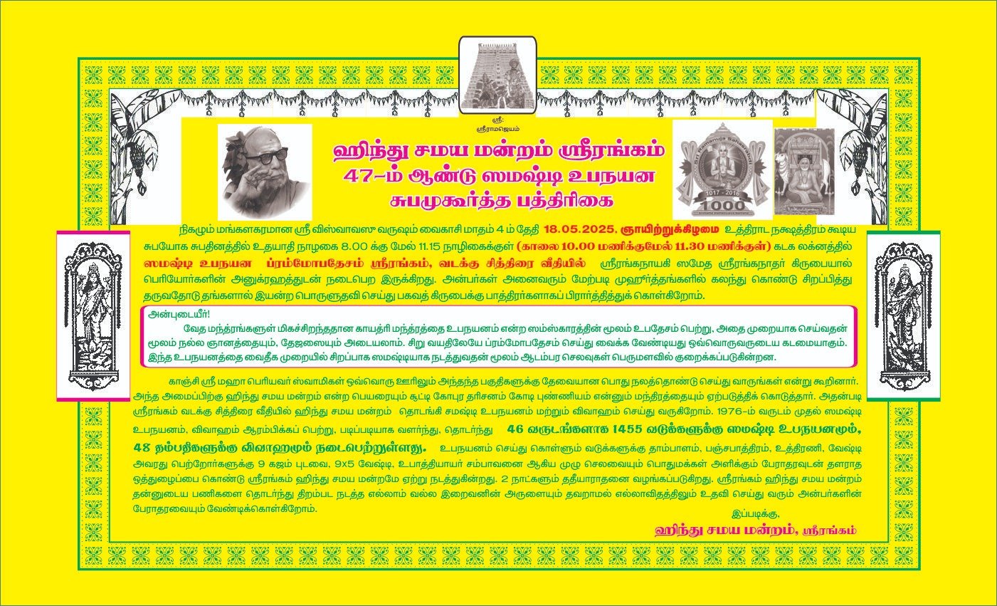 Hindu Samaya Mandram Srirangam is a charitable trust mainly performing Samashti Upanayanam in the month of MAY every year especially hailing from economically poor families absolutely at free of cost for the past Forty Three years at Goratha Moolai, North Chitra Street, Srirangam, Trichy in a grand manner with the blessings of divine couple.